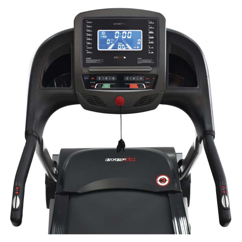 - Displej. Přehledný LCD displej (17,2 x 7,9 cm) s modrým podsvícením zobrazuje měřené hodnoty: čas, rychlost, tréninkovou vzdálenost, puls a počet spálených kalorií. Udává také stupeň sklonu pásu a číslo zvoleného programu. Rychlá volba rychlosti (3-6-9 km/h) a sklonu pásu (3-6-9 %) pomocí funkčních tlačítek na displeji.