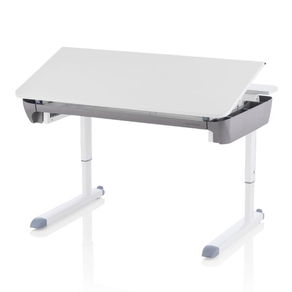 rostoucí psací stůl pro děti, nastavitelný sklon pracovní desky, výsuvná zásuvka, multifunkční pravítko, integrovaný box na kabely, transportní kolečka, deska bílá – šedá, vyroben v Německu