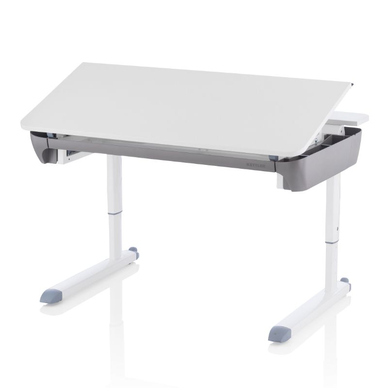 Dětský psací stůl ze série KETTLER MAZE zaujme svým cool designem a dokonalou ergonomií s řadou propracovaných detailů. Stůl je navržen tak, aby doslova rostl spolu s dítětem. Jednoduchým otáčením kličky lze nastavit výšku stolu v šesti úrovních, v rozmezí 54-83 cm, což zaručí komfortní a zdravé sezení předškolákům i starším studentům. Pracovní plocha je variabilní. Pevná zadní část nabízí prostor pro odložení sešitů a učebnic, u přední části lze nastavit sklon pro pohodlnější psaní a kreslení. Ve výbavě nechybí ani prostorná výsuvná zásuvka na psací potřeby, boční zásuvka na drobnosti a multifunkční pravítko.