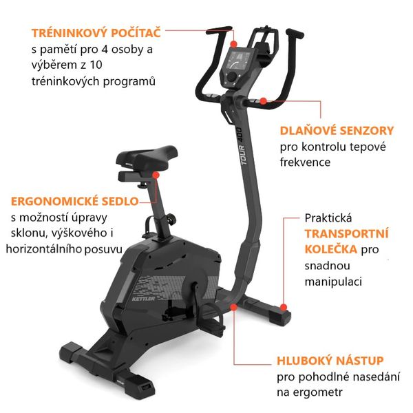 Ergometer KETTLER TOUR 400 s hlbokým nástupom predstavuje cenovo dostupný trenažér vhodný pre efektívny domáci tréning celej rodiny. Ergometer je vybavený množstvom praktických prvkov, vďaka ktorým sa dokonale prispôsobí potrebám trénujúceho. Od pohodlného fitness sedla s možnosťou výškového aj horizontálneho posunu, cez riadidlá s variabilným úchopom, až po prehľadný počítač s intuitívnym ovládaním. Pre motivačný tréning si možno vyberať z 10 integrovaných programov, vrátane pulzom riadeného módu. V pamäti počítača môžu byť trvalo uložené osobné dáta pre 4 osoby súčasne. Veľkou prednosťou je tiež možnosť prepojenia trenažéra so smartfónom alebo tabletom a využitie tréningovej aplikácie KETTMaps.