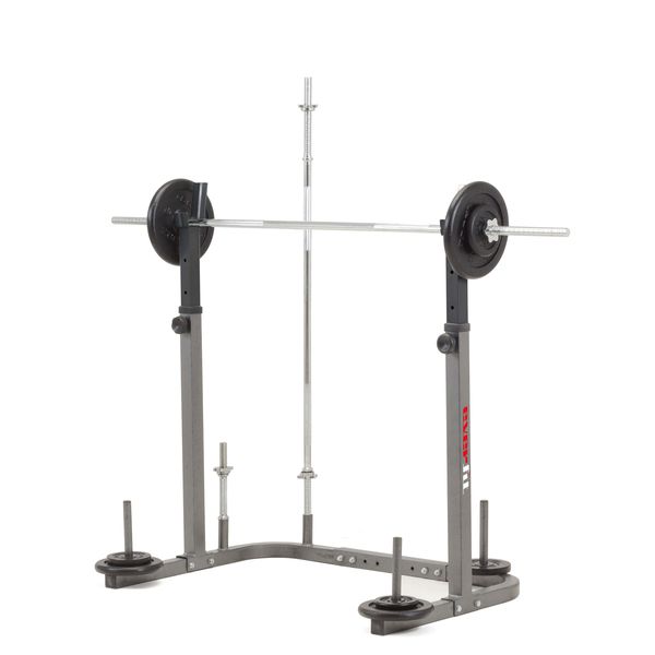 stojan na dlouhou činku, trny na další kotouče, dva stojany na činkové tyče, nastavitelná výška i šířka, max. zatížení 150 kg, hmotnost 15,5 kg