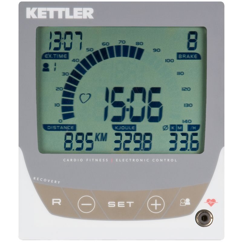 - Tréninkový počítač. Velký a přehledný Twin-displej s pamětí pro ukládání osobních dat 2 osob. Měří čas, rychlost, tréninkovou vzdálenost (včetně celkového počtu ujetých km), puls, frekvenci šlapání a spotřebu energie v závislosti na brzdném stupni. Optická i akustická signalizace při překročení horní hranice pulsu spolu se zobrazením procentuálního údaje. Vyhodnocení vydýchávacího pulsu včetně stanovení kondiční známky 1-6. Možnost předvolby cílových hodnot pro čas, vzdálenost, spotřebu energie a kardiozóny (Fat/Fit/manual).